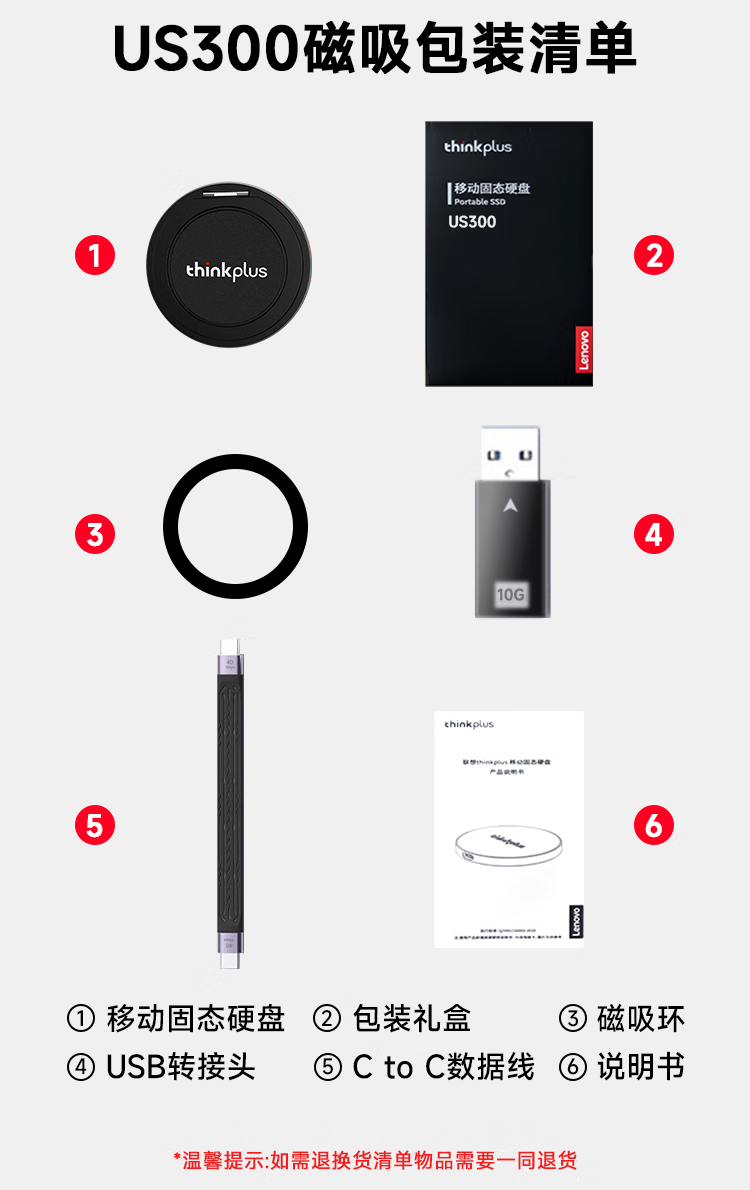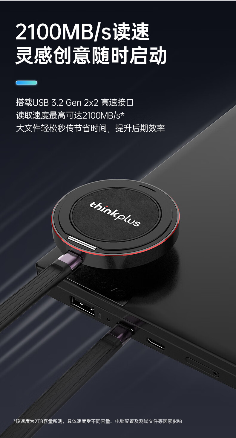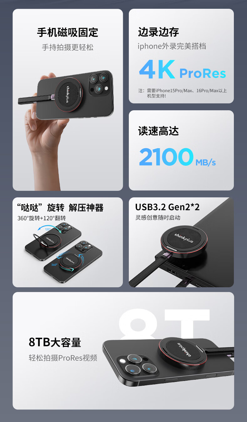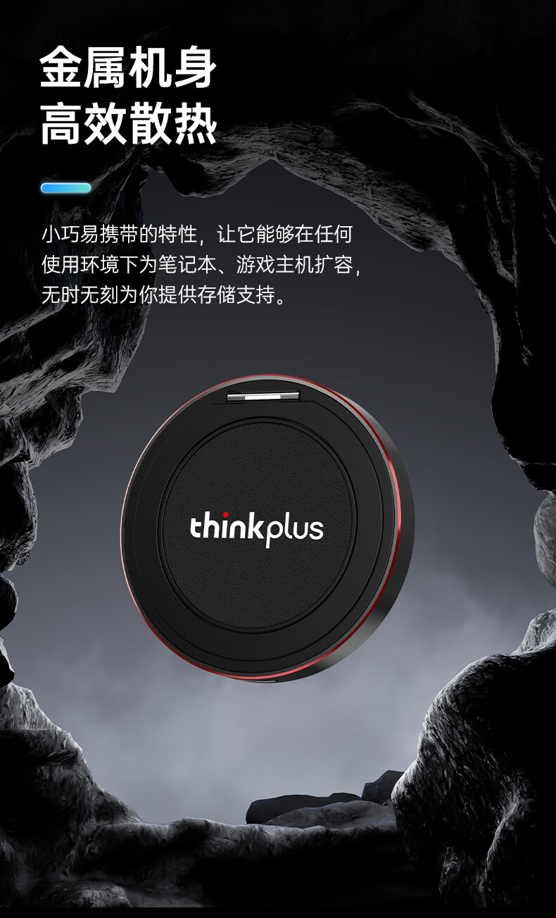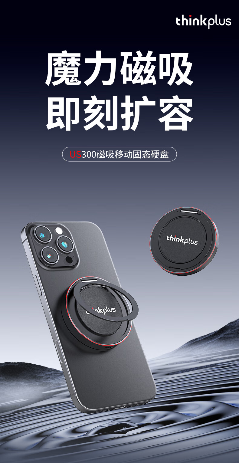 ThinkPlus联想 1TB磁吸移动固态硬盘 带手机支架磁吸USB3.2高速读取2000MB/S PSSD小巧便携 US300小飞盘系列