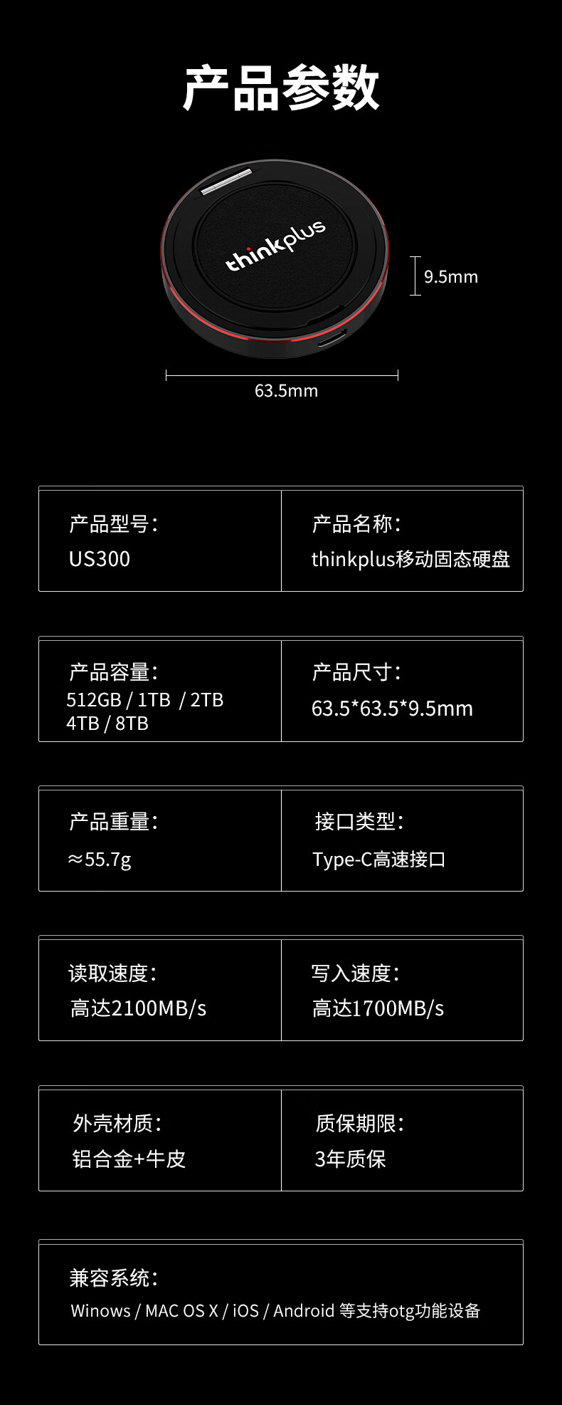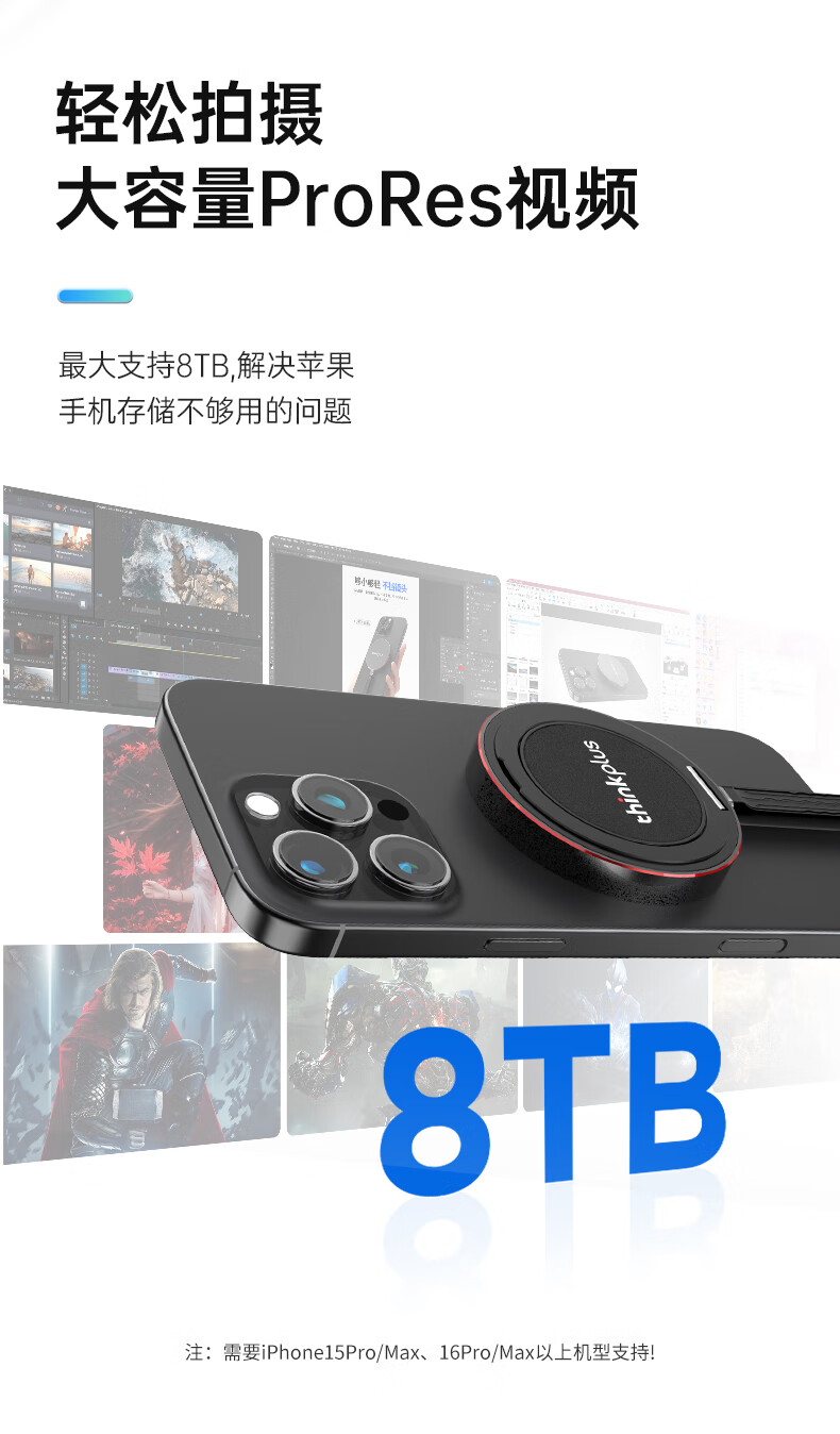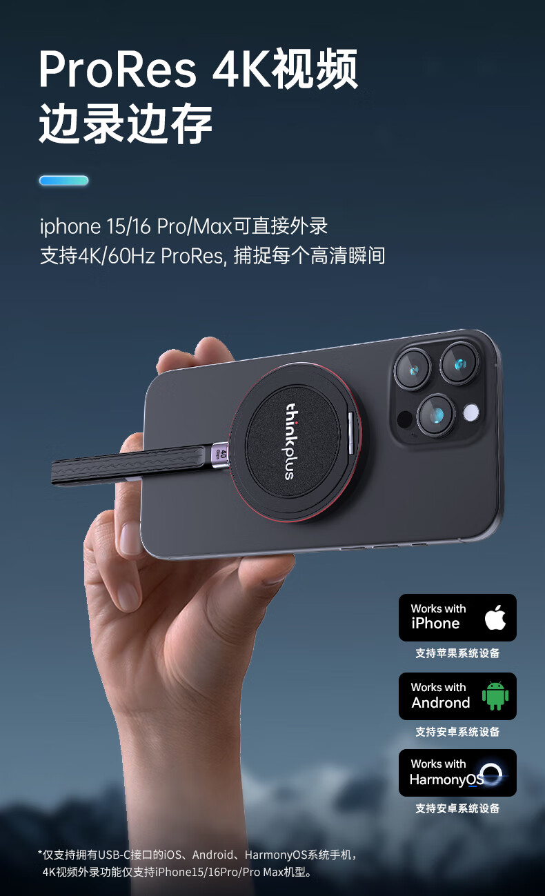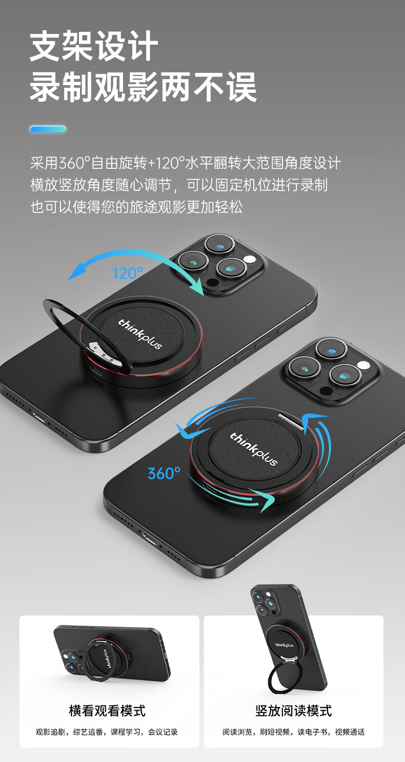 ThinkPlus联想 1TB磁吸移动固态硬盘 带手机支架磁吸USB3.2高速读取2000MB/S PSSD小巧便携 US300小飞盘系列