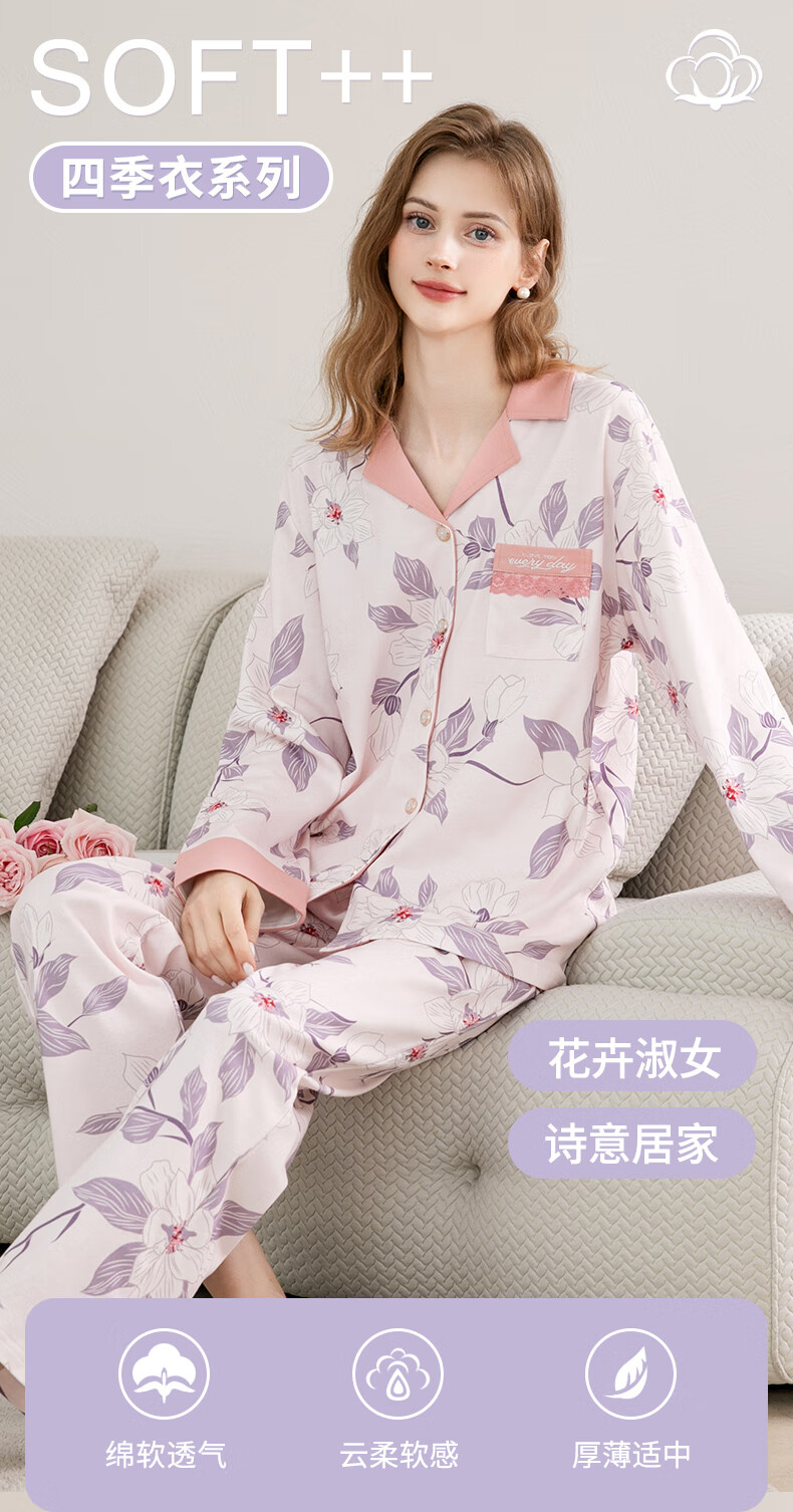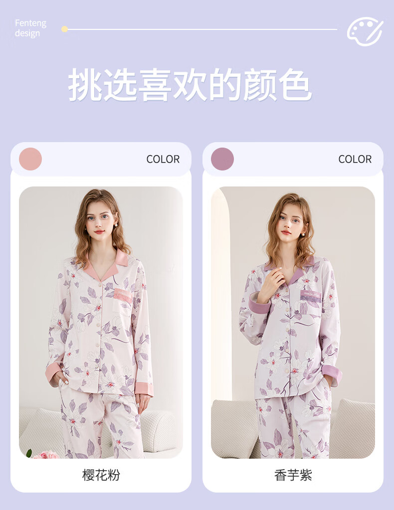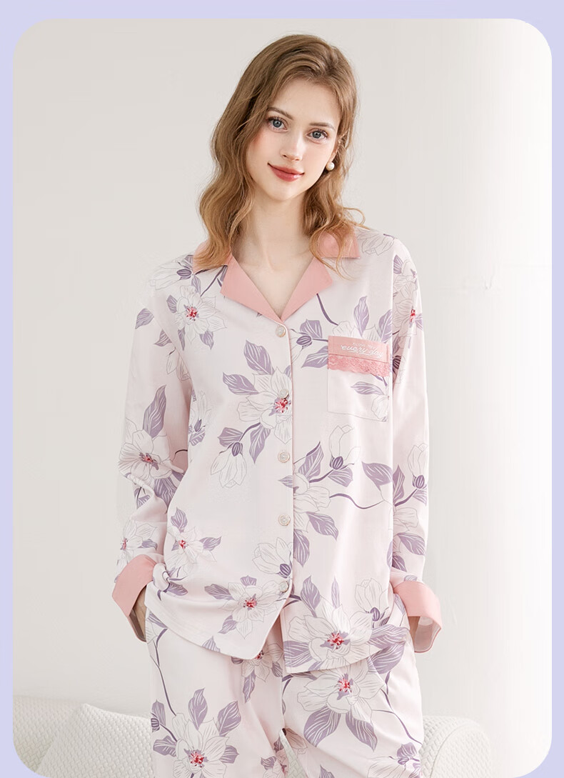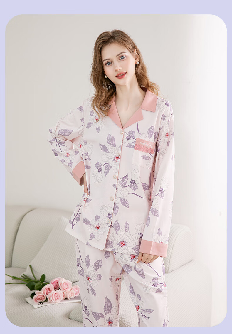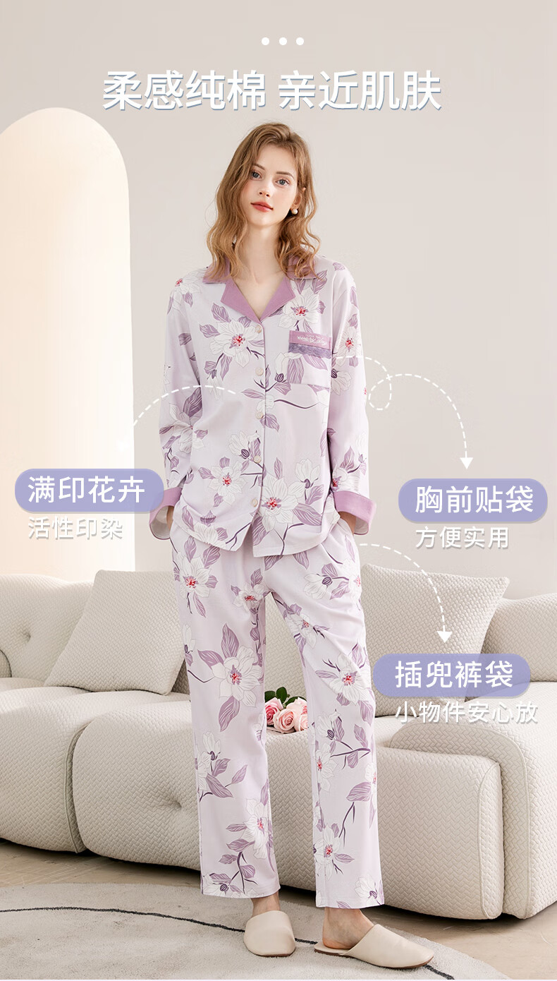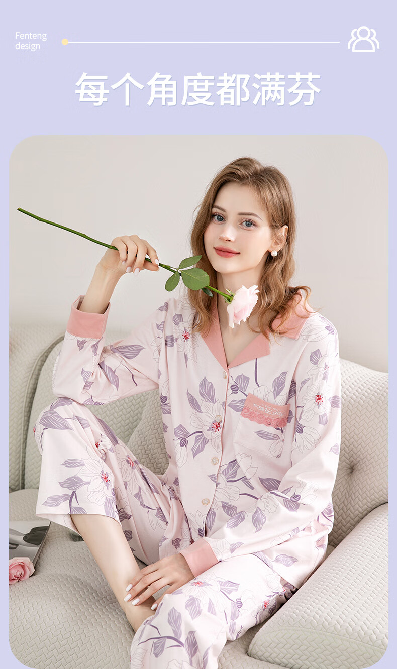 芬腾睡衣女【浪漫花卉柔感纯棉】早秋开衫长袖100%棉家居服女套装 樱花粉 XL