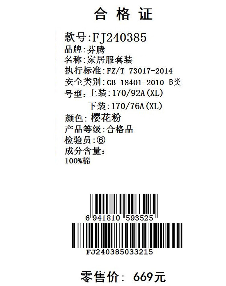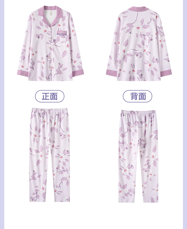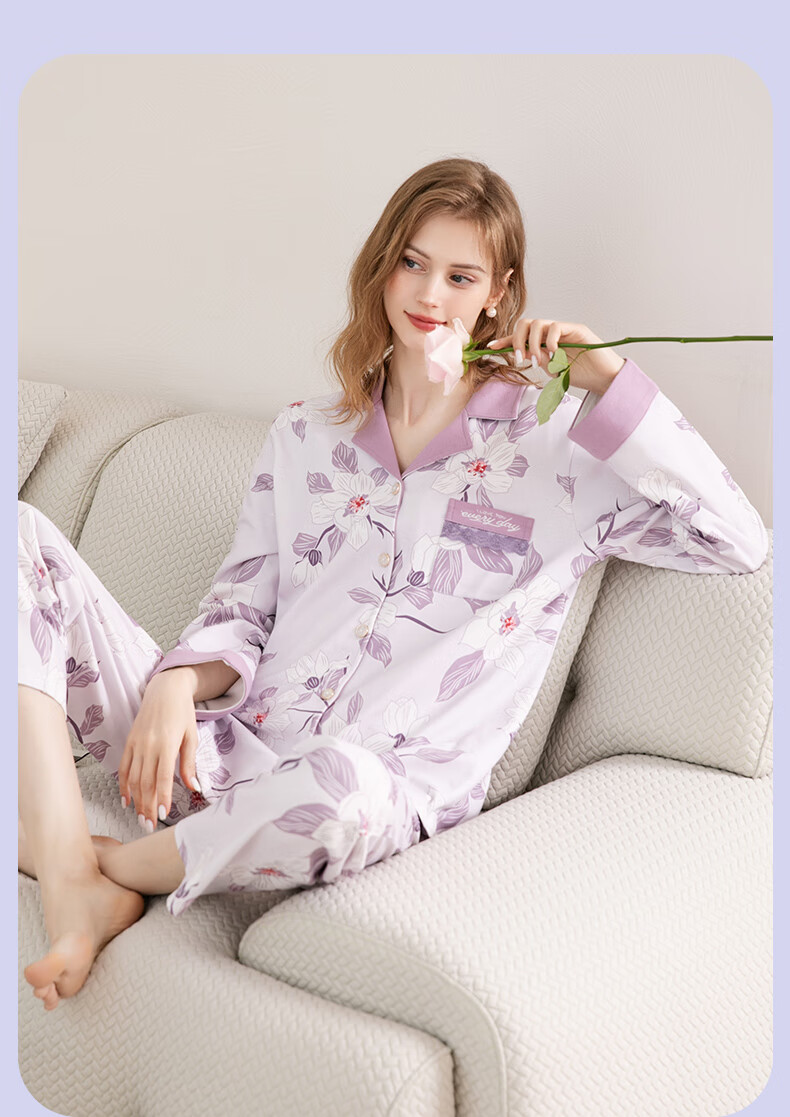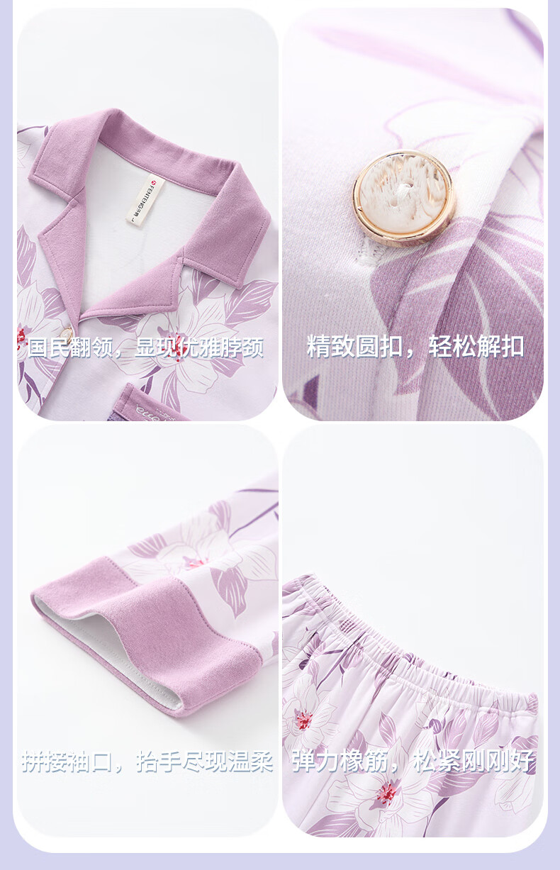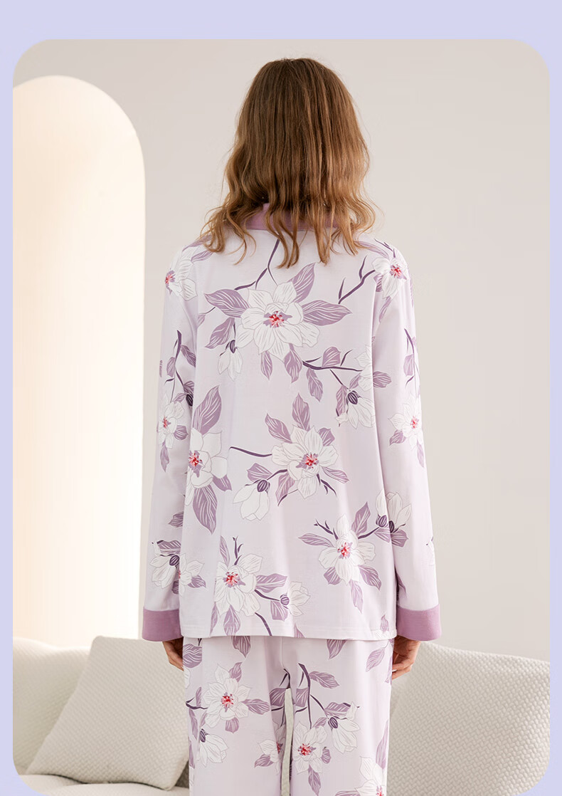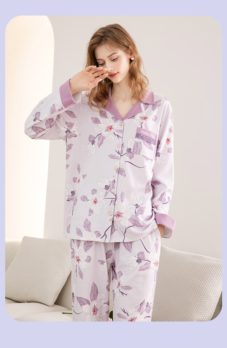 芬腾睡衣女【浪漫花卉柔感纯棉】早秋开衫长袖100%棉家居服女套装 樱花粉 XL